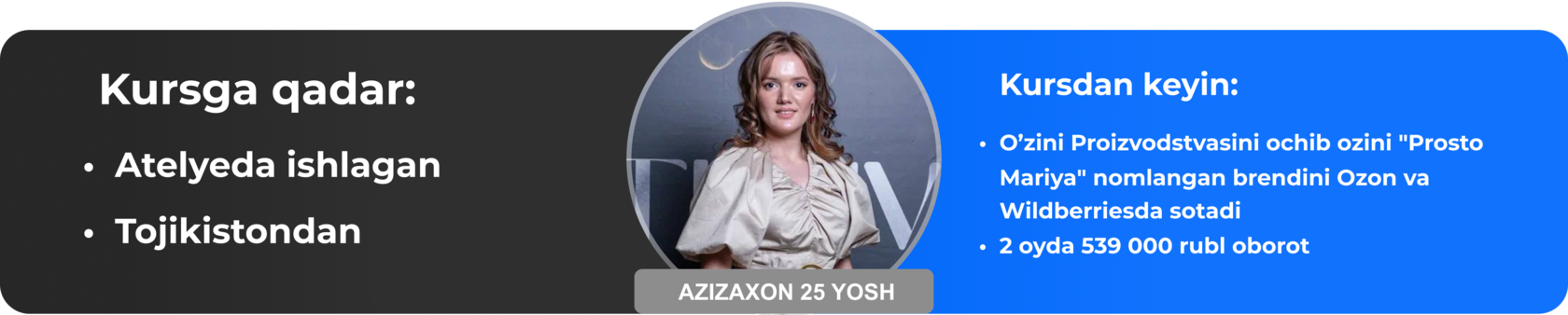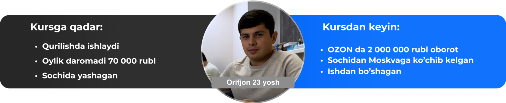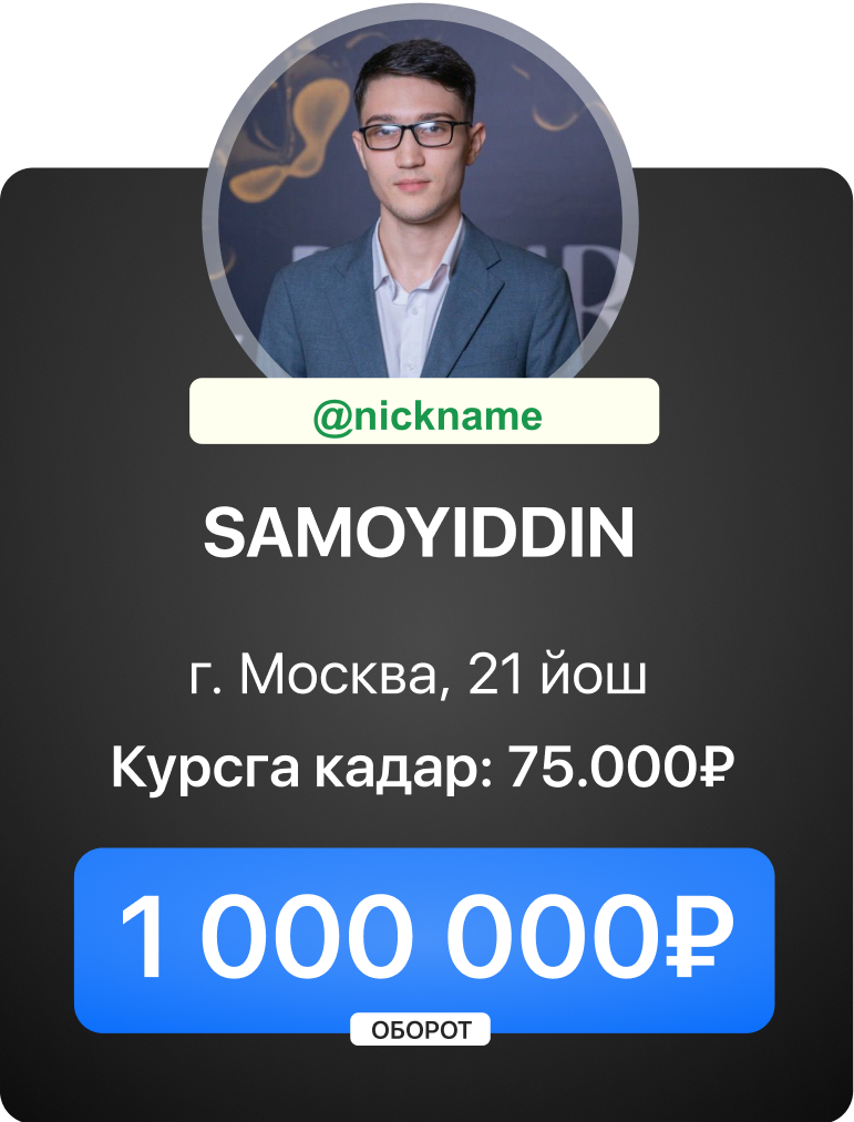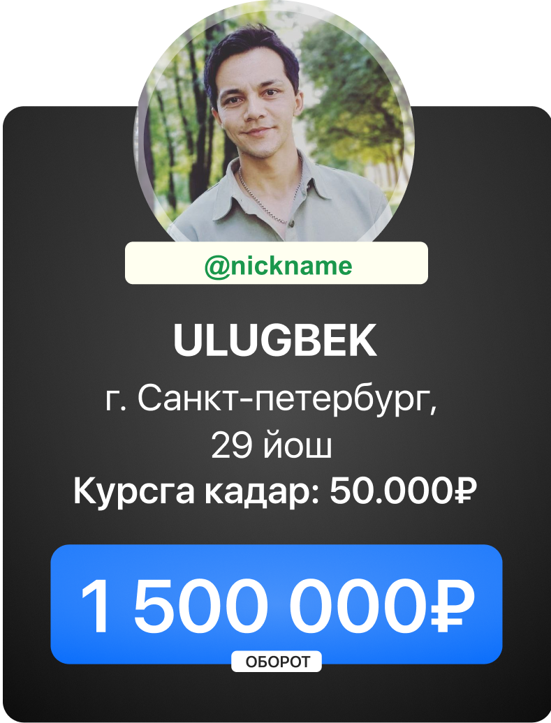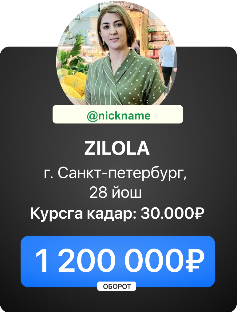 Сиз даромат олишни курс давомида бошлашингиз мумкин. Дарслар ва топшириқлар шундай тузилганки, сиз биз билан бирга босқичма-босқич “OZON”, “Wилдберриес”га кириб борасиз ва сотишни бошлайсиз.