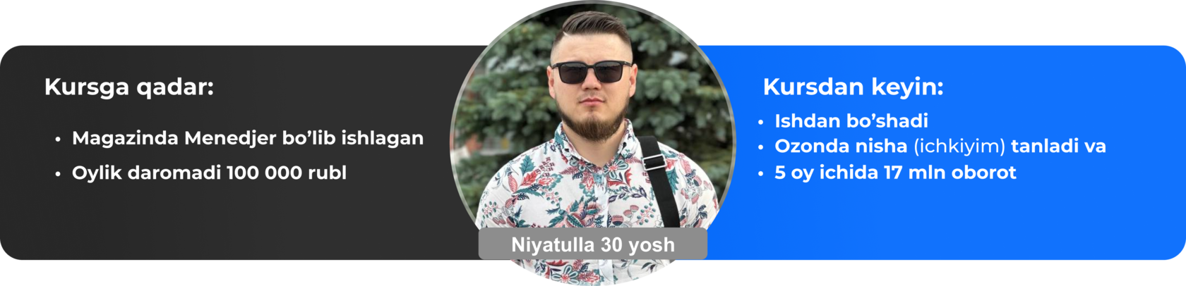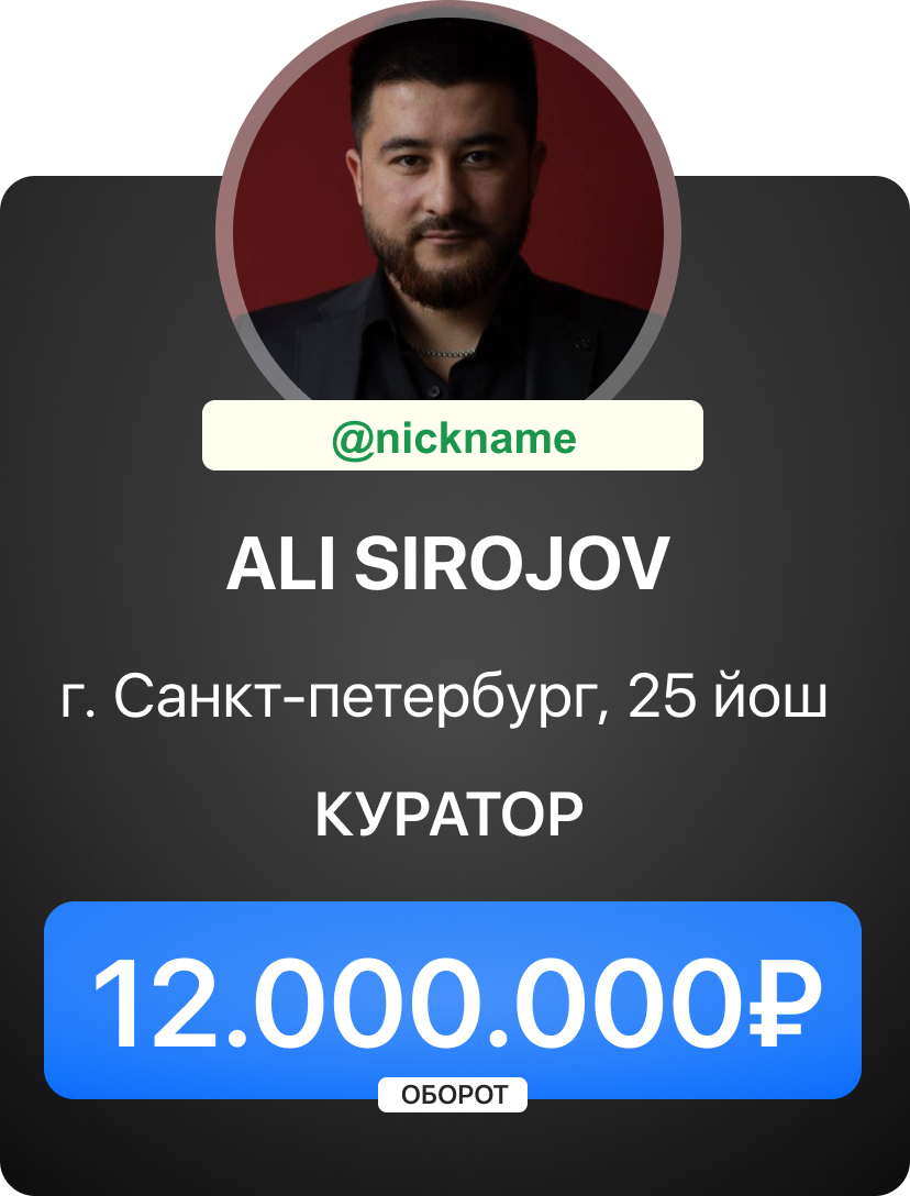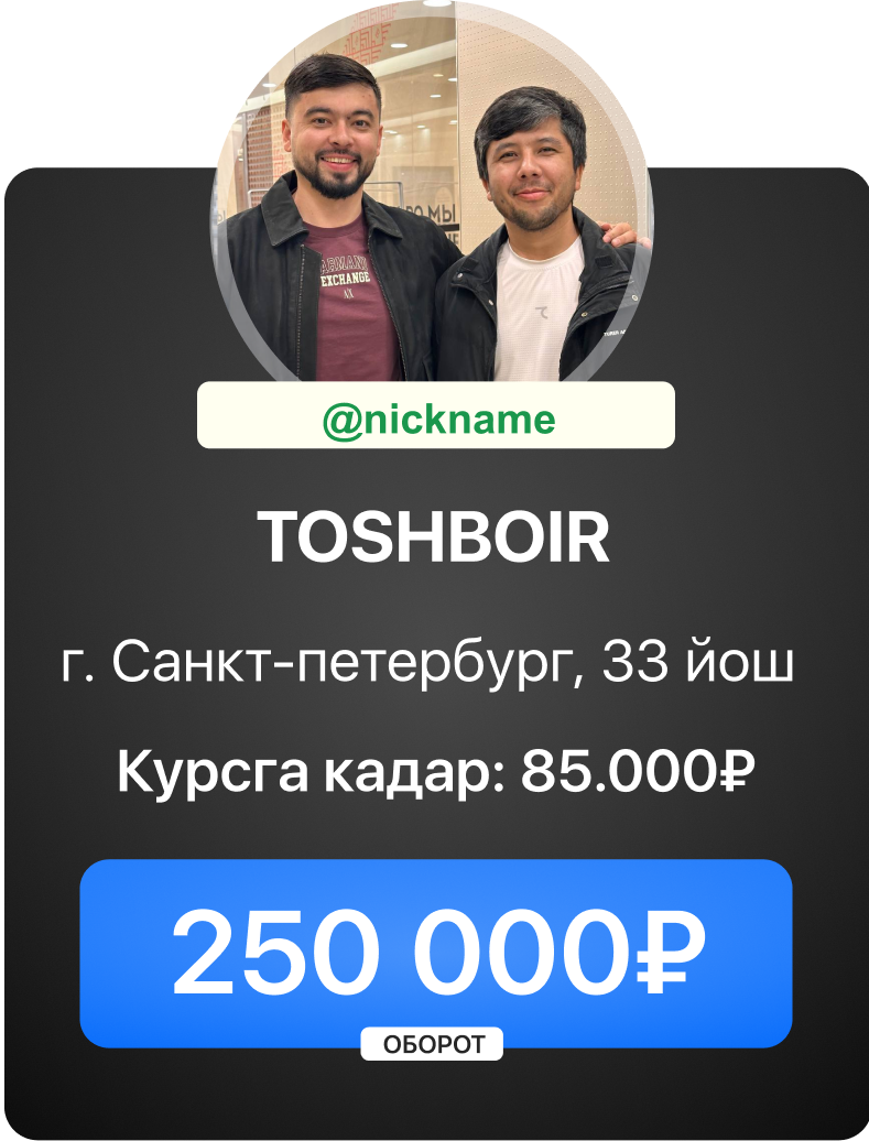 Бизнес бошлаш учун махсус курс дастури. Талабалар менинг барча ишланмаларимни, алокаларимни ва товар бизнеснинг таййор ечимларини олишади.
