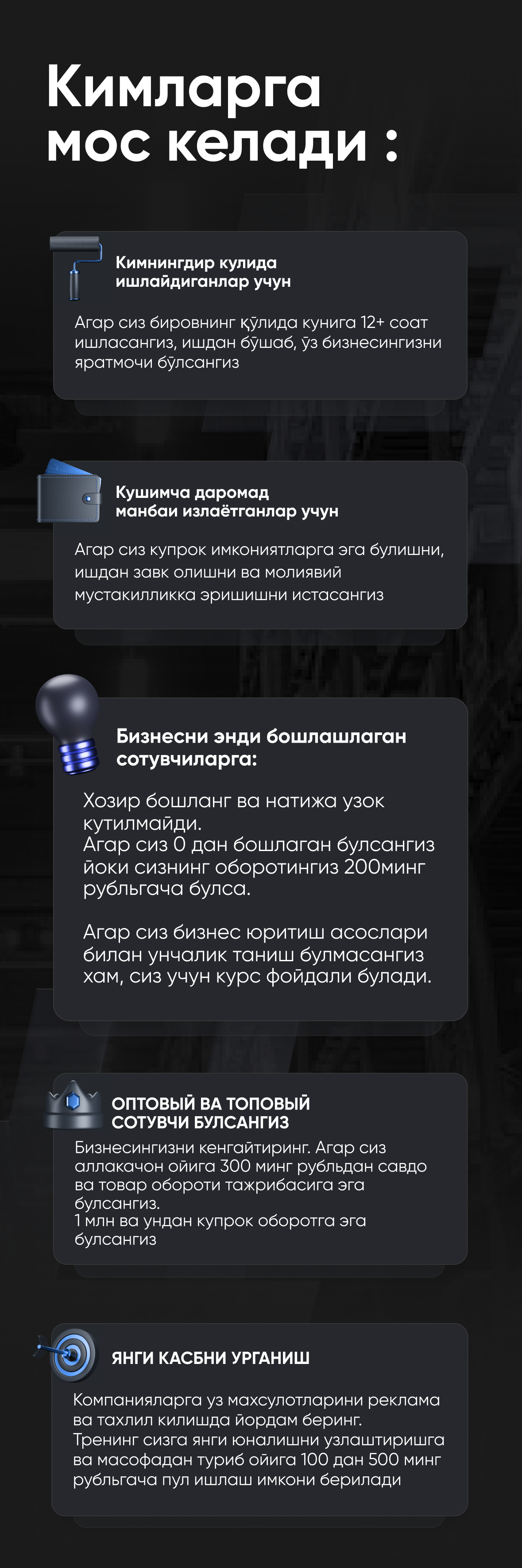 Шунинг учун, курсга келинг ва бизнесни ривожлантириш буйича боскичма-боскич стратегияни урганинг.